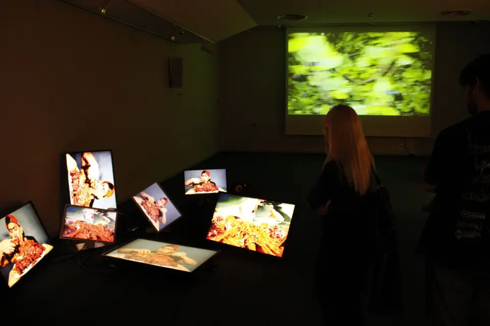 Ideas such as hyperconsumption and excess, whether of food or of data, intertwine to explore monstrous, abject, and distorted visualities that emerge from the interaction between artificial intelligence and mukbang. Mukbang is an online entertainment trend that consists of watching people consume large quantities of food, either while interacting with the audience or in silence. The mediatization of an event as intrinsically human as eating transports us visually into a liminal state of contemplating artificiality, repulsion, and the grotesque. “Bite Byte” is presented as a multiscreen audiovisual installation that traces a process of image degradation. Three typologies emerge: raw, unaltered clips; clips processed by artificial intelligence; and, finally, clips altered by a pixel-sorting algorithm.
