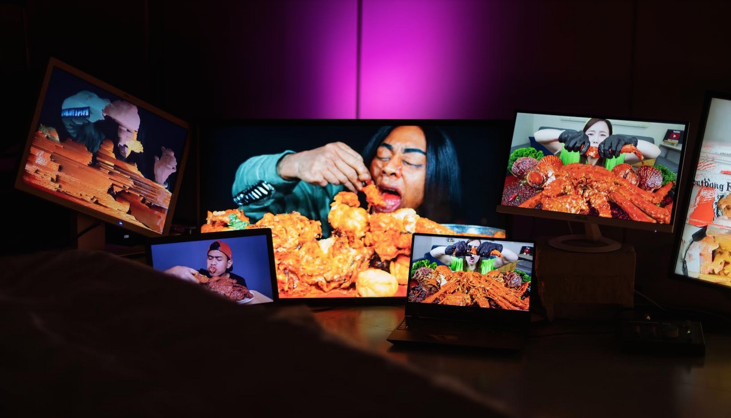 Ideas como el hiperconsumo y el exceso, ya sea de comida o de datos, se entrelazan para explorar visualidades monstruosas, abyectas y distorsionadas que surgen de la interacción entre la inteligencia artificial y el mukbang. El mukbang es una tendencia de entretenimiento en línea que consiste en ver a personas consumiendo grandes cantidades de comida, ya sea interactuando con el público o en silencio. La mediatización de un acontecimiento tan intrínsecamente humano como es el comer nos transporta visualmente a un estado liminal de contemplación de la artificialidad, el rechazo y lo grotesco. 'Bite Byte' se presenta como una instalación audiovisual multipantalla que recorre un proceso de degradación de la imagen. Aparecen tres tipologías, los clips en bruto, sin alterar, los clips procesados por inteligencia artificial y, finalmente, los clips alterados por un algoritmo de distorsión.